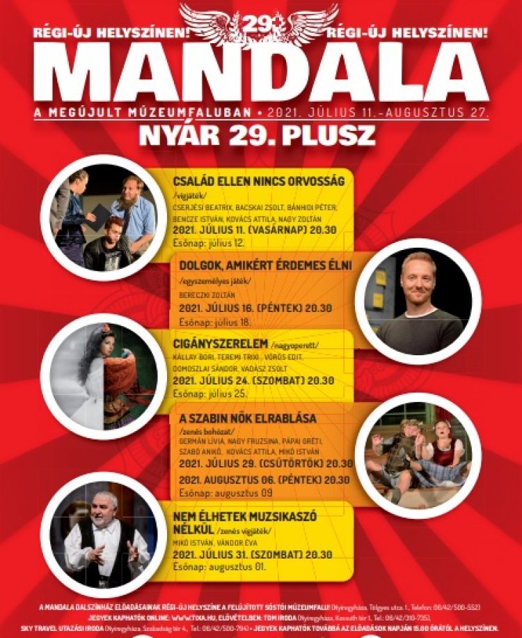 Július 12-én, az esőnapon a Család ellen nincs orvosság előadást tekinthették meg az érdeklődők. A tavalyi fél nyarat és a mostani szűkített esztendőt is tekintve a Mandala Nyár a 29.Plusz számot viseli idén a program. Saját előadások és vendégjátékok fogadják a Sóstói Múzeumfaluban a Mandala közönségét július 11. és augusztus 27. között.