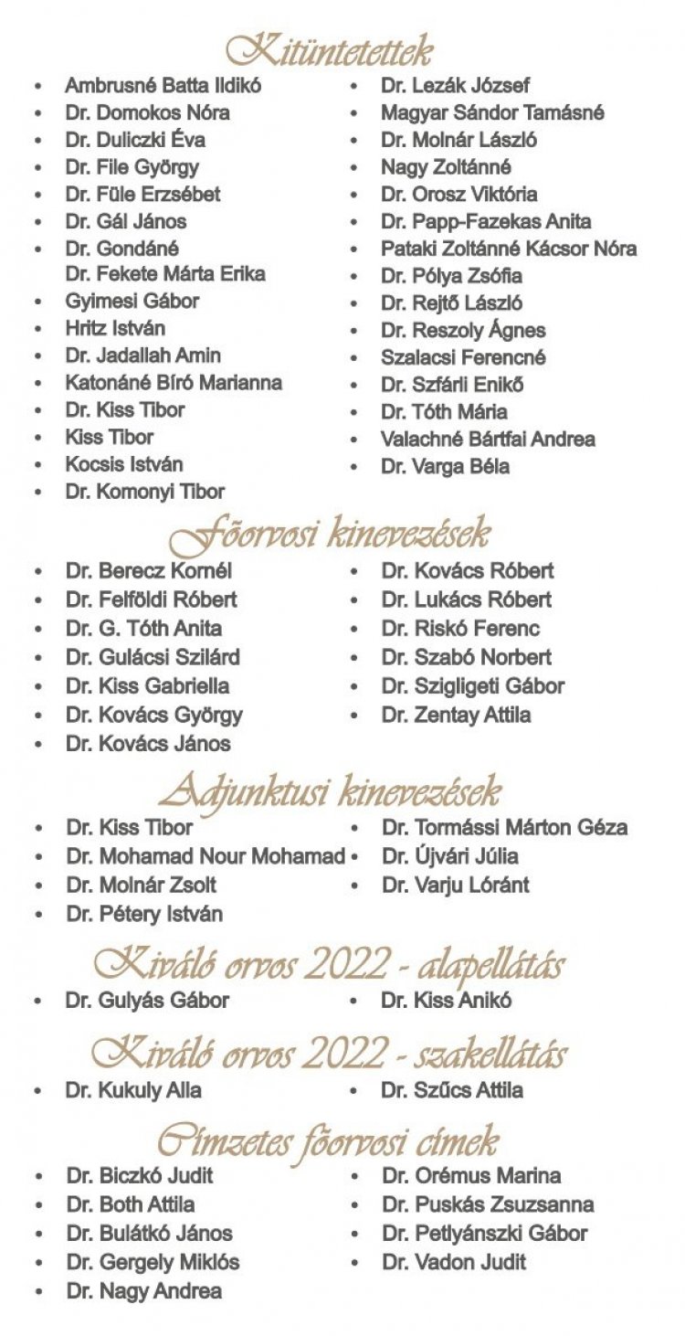 – Minden kitüntetésben és kinevezésben részesülő munkatársunknak szívből gratulálunk! – osztotta meg a kitüntetettek névsorával együtt a gratulációt hivatalos közösségi oldalán a Szabolcs-Szatmár-Bereg Megyei Kórházak és Egyetemi Oktatókórház.