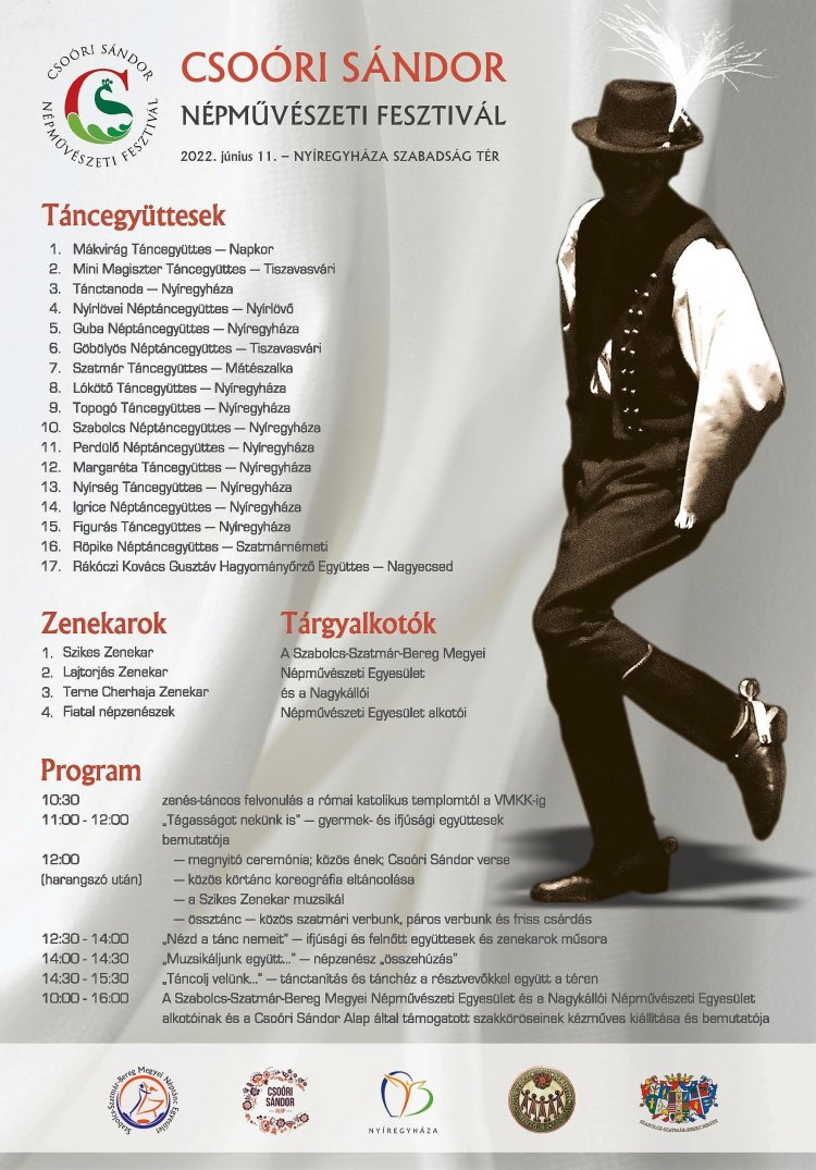 Nyíregyháza az utóbbi időben ismét a fesztiválok városává vált. Június 11-én egy másik, nagyszabású esemény is lesz a városközpontban, ezúttal azonban arra kérem az érdeklődő és a folklór értékei iránt is fogékony nyíregyházi és megyei közönséget, hogy látogassanak el a Szabadság térre is, nézzük meg közösen, hogy mit is jelentett a Csoóri Sándor Alap támogatása együtteseink, zenekaraink és tárgyalkotóink számára, milyen nagyszerű produkciókkal készültek erre a Kárpát-medencei fesztiválra, s vegyenek részt interaktív programjainkon is!