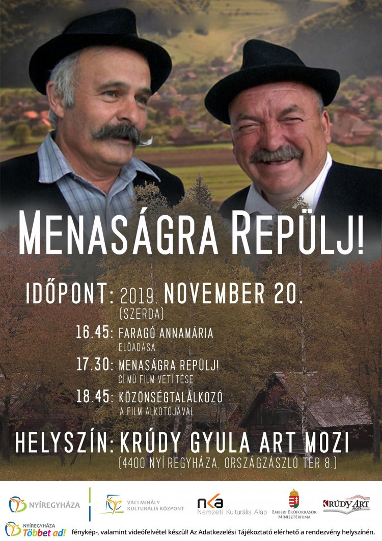 Faragó Annamária Menaságra repülj! című dokumentumfilmjét mutatják be november 20-án Nyíregyházán, a Krúdy Art Moziban. A film alkotója előadást és közönségtalálkozót is tart.