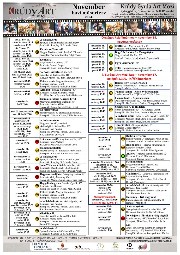 Ebben a hónapban jön az Országos Rajzfilmünnep, válogathatunk a VII. Európai Art Mozi Nap és a Mozinet Filmnapok alkotásai közül, de jön a Venom új fejezete, a Gladiátor II. Denzel Washingtonnal és végre megnézhetjük Herendi Gábor legújabb filmjét is a Futni mentemet is, amiben a zseniális Udvaros Dorottya kapott főszerepet.