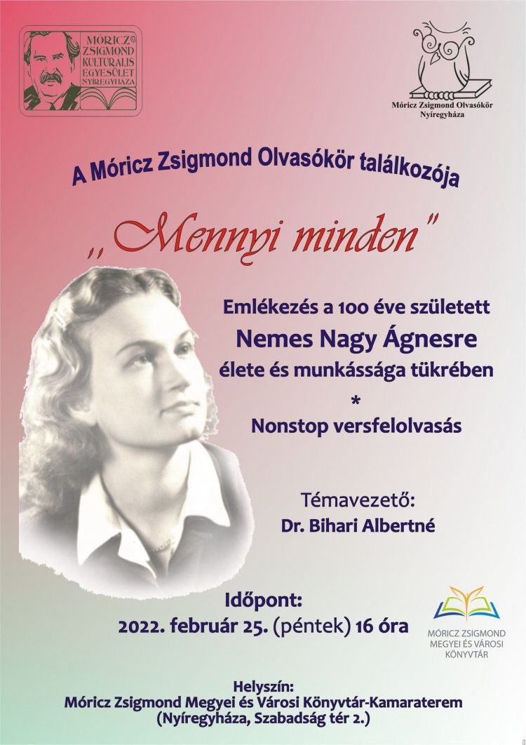 A Móricz Zsigmond Olvasókör február 25-én tartja találkozóját a Móricz Zsigmond könyvtárban. Az irodalombarátok a 100 éve született Nemes Nagy Ágnesre emlékeznek.