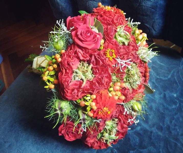 – Mindig befutnak hozzám különleges kérések. A napokban például egy olyan menyasszony keresett meg, aki a nagy napon indiai száriban megy férjhez és pipacsból, valamint piros mezei virágokból készült csokrot képzelt el magának. A probléma az volt, hogy a pipacs már régen elvirágzott, ráadásul 2 perc alatt meghal. Sokat gondolkodtam azon, hogy mivel lehetne helyettesíteni. Az interneten találtam egy Red Eye nevezetû rózsát, amihez végül némi Frézia Hypericumot tettem, meg egy kis Zinnia-t megfûszerezve egy kis Borzaskatával. Remélem, hogy jól illik majd az elefántcsont színû, arannyal kivarrt szárihoz.