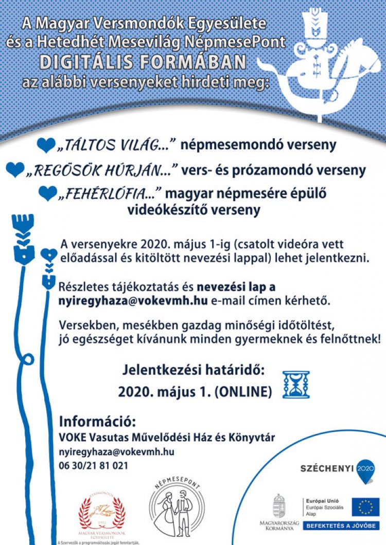 Mese- és versmondó és magyar népmesére épülő videókészítő versenyre hívja a versek és mesék kedvelőit a Vasutas Művelődési Ház. A versenyekre 2020.május 1-ig (videóra vett előadással és kitöltött jelentkezési lappal) online lehet jelentkezni.