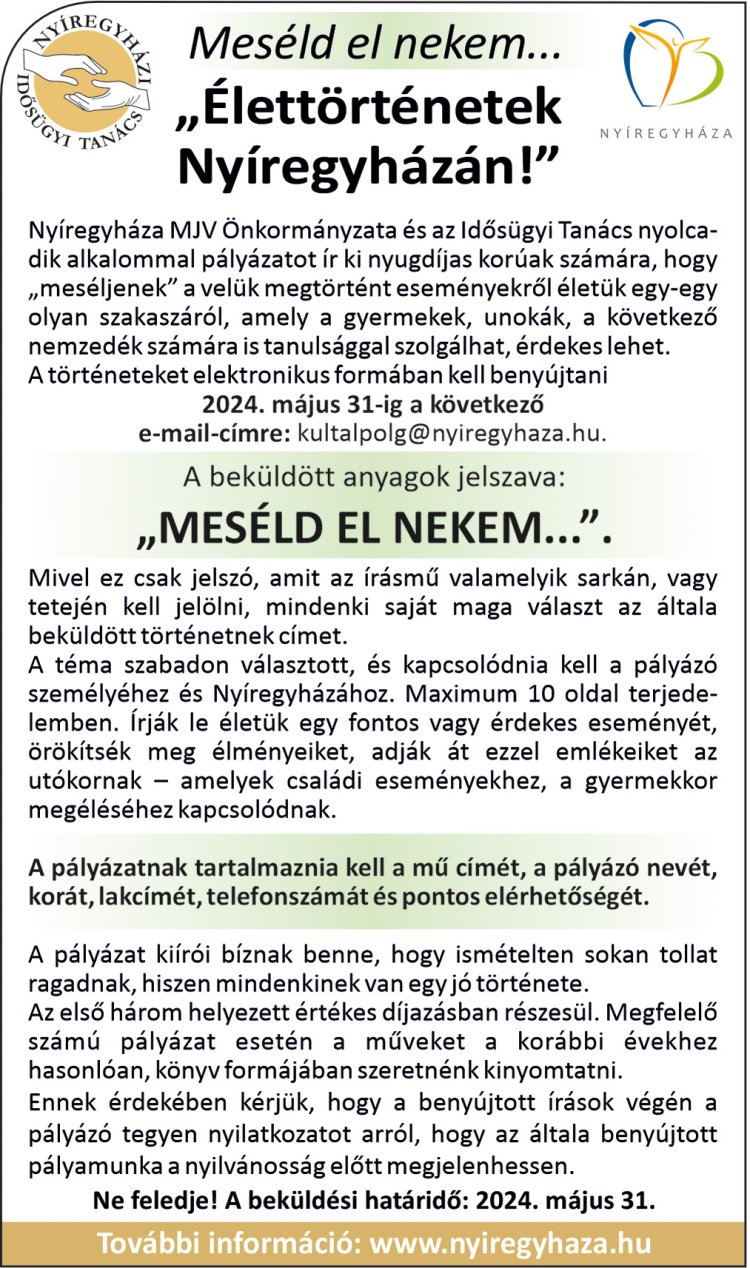 Nyíregyháza MJV Önkormányzata es az Idősügyi Tanácsa nyolcadik alkalommal pályázatot ír ki nyugdíjas korúak számára, hogy ,,meséljenek" a velük megtörténte eseményekről életük egy-egy olyan szakaszáról, amely a gyermekek, unokák, a következő nemzedék szamara is tanulsággal szolgálhat, érdekes lehet.