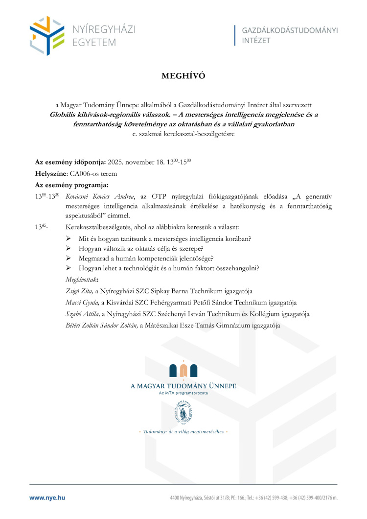 A Magyar Tudomány Ünnepe alkalmából a Nyíregyházi Egyetem Gazdálkodástudományi Intézete egy nagyszabású szakmai eseményt szervezett „Globális kihívások-regionális válaszok” címmel. A rendezvény központi témája a mesterséges intelligencia megjelenése és a fenntarthatóság követelménye az oktatásban és a vállalati gyakorlatban.