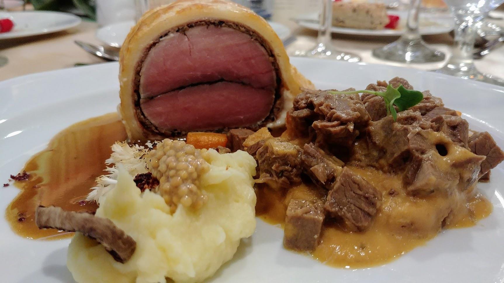 A spárgafőzelék zöldségekkel és a hozzá mellékelt fűszeres csirkefasírt csak egy epizód volt az estén, de megérte megkóstolni. Ahogy a kovászos uborka sorbet is egy könnyű poén ahhoz képest, ami a főételként érkezett az asztalokra… Na jó kellett hozzá Munkácsi Anita és Nagyidai Gergő operettegyvelege, hogy legyen hely a pocókban. De ezt követően felszolgálták a méltán hírneves Wellington bélszínt, borjúból, egy tányéron az azóta már legendává változott, vadasan főzött bivalyraguval. Némi áfonya, erdei gombák és egy kis burgonya kíséretében.