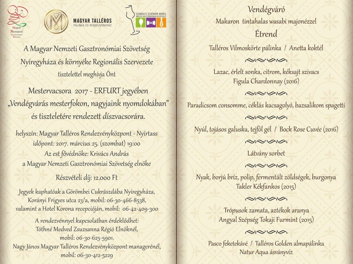 Időpont: 2017. március 25. 19.00 óra, helyszín: Magyar Talléros Rendezvényközpont, Nyírtass. Az Erfurtban, 2016 októberérben megrendezett Gasztronómiai Olimpián megyénk szakács- és cukrászmesterei fantasztikus eredményeket értek el, így természetes, hogy a vacsoraest ennek jegyében zajlik! Az Erfurti Olimpián bemutatott menüsorokból állítják össze a vacsoraest gerincét, mely igen újszerűnek mondható. A menüsor mellé természetesen hozzáillő borsort is kínálnak, nem is beszélve a helyszín pálinkakínálatáról, a vendégfogadó meglepetésekről. Fényképes-videós visszatekintést is láthatnak a vendégek Erfurtról és megismerhetik személyesen is versenyzőinket. A szakképző iskolák díszasztalai mellett zöldségszobrászattal, dísztorta bemutatóval, csokoládé szökőkutakkal, látvány sorbettel, tükörszervizzel is elkápráztatják a majdani kedves vendégeket, az ígéretek szerint.