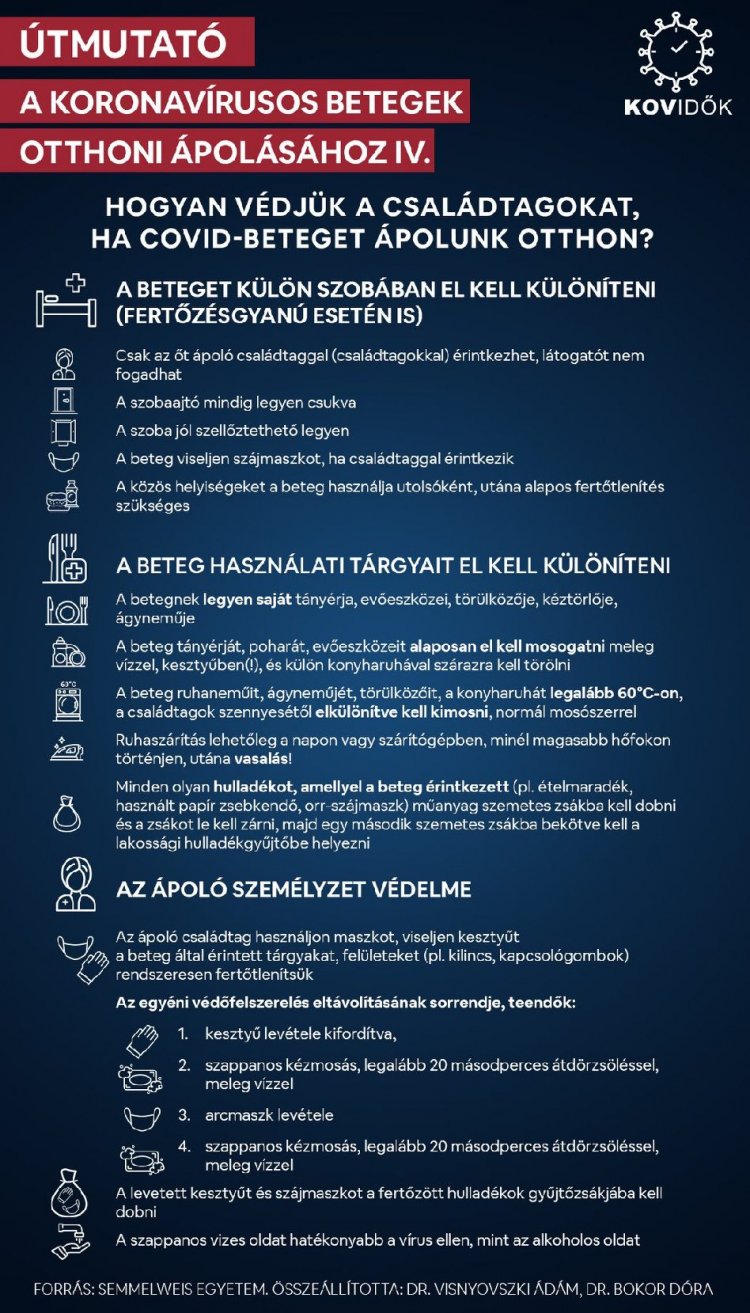 Hogyan védhetjük meg az egészséges családtagokat, ha koronavírusos beteget ápolunk otthon? A beteget ápoló családtag, vagy családtagok védelme legalább ugyanolyan fontos, mint a beteg aktuális szükségleteinek megfelelő ellátás biztosítása – írta a KOVIDők nevű Facebook oldal, akik részletes útmutatót készítettek a koronavírusos betegek otthoni ápolásához.