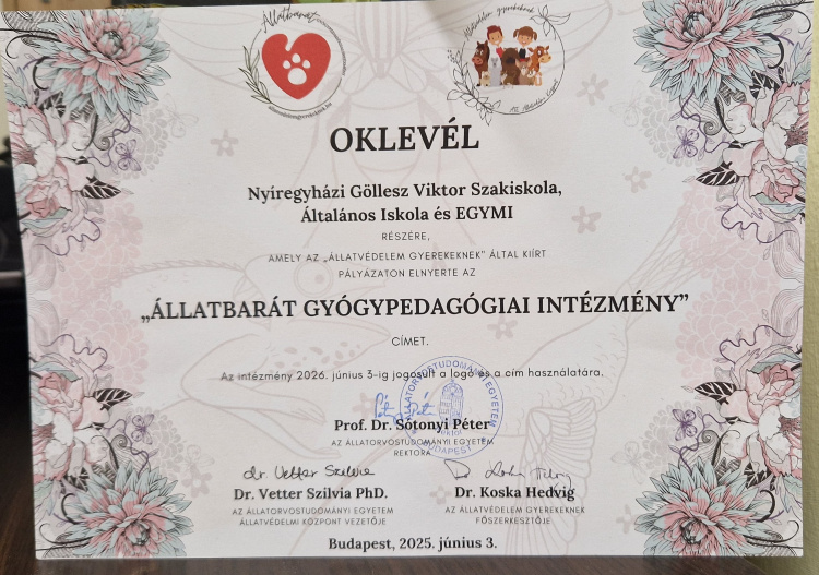 „Állatbarát gyógypedagógiai intézmény” címet kapott a Nyíregyházi Giillesz Viktor Szakiskola, Általános Iskola és Egységes Gyógypedagógiai Módszertani Intézmény. A két éve már ökoiskolaként működik Göllesz most újabb eszközökkel tesz meg mindent a sajátos nevelési igényű tanulókért.