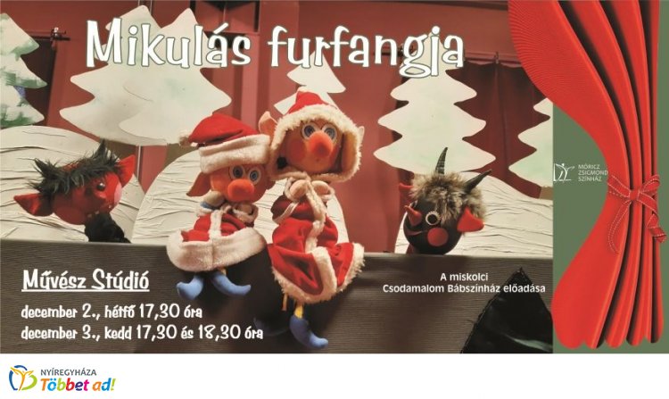 Így, vendégműsoraként 3 alkalommal megtekinthetik a MIKULÁS FURFANGJA című gyermek előadást a Művész Stúdióban, mely a miskolci Csodamalom Bábszínház produkciója:
