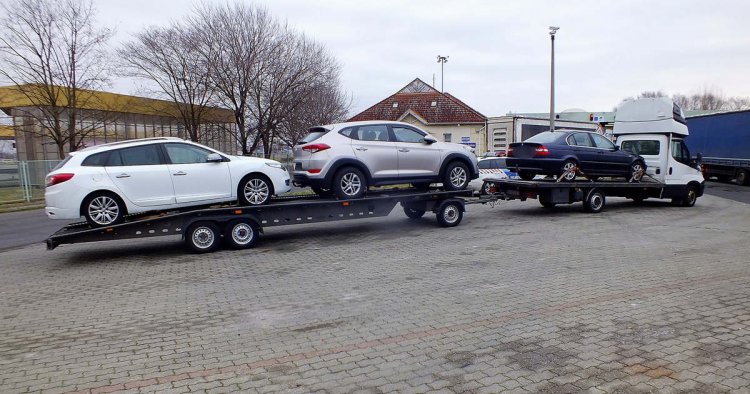Két autószállító trélert kötöttek össze, úgy vontatták egymást Csongrád-Csanád megyében szerb sofőrök. Kilóg a kocsi hátulja a teherautóból, ez az utolsó kocsi a sorban, előtte még kettő haladt, az első platós teherautó rakománya is kis lecsúszott.
