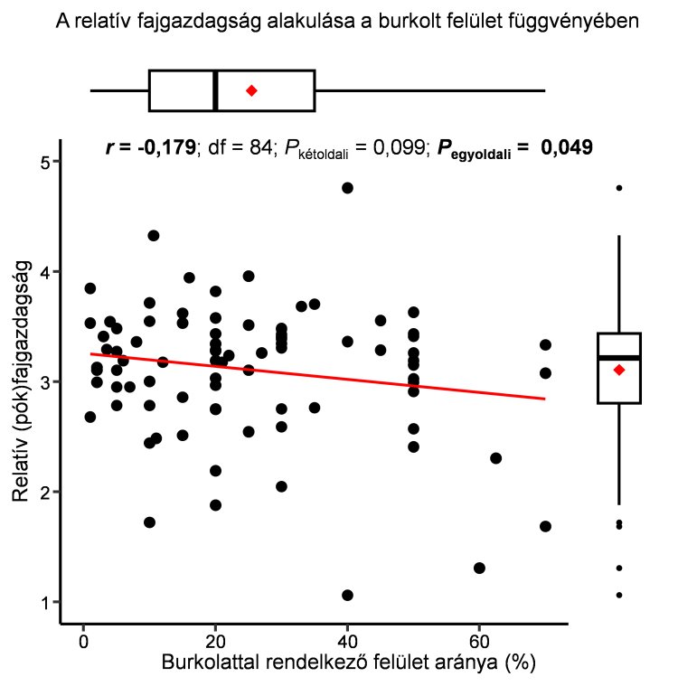 A kutatók megvizsgálták, hogy a természetes/féltermészetes élettér kerten belüli aránya milyen hatással van a kertek fajgazdagságára nézve. Ehhez összevetették a kerttulajdonos által megadott adatokat a kertek relatív (pók)fajgazdagságával, és eredményül azt kapták, hogy a fajgazdagság és a mesterséges burkolattal rendelkező felület aránya között szignifikáns negatív kapcsolat van. Ez lényegében azt jelenti, hogy a burkolt felület arányának növekedésével valamelyest csökken a kertek fajgazdagsága. Nyilvánvalóan minél nagyobb területet foglalnak el a kertben az épületek, burkolt teraszok, járdák stb., annál kevesebb természetes/féltermészetes élettér marad az élőlények számára, annál egysíkúbb lesz a kert póknépessége is. Általánosságban véve az élettér nagyságának növekedésével annak szerkezeti sokfélesége is növekedni szokott, mely így annál inkább kedvez a biológiai sokféleségnek. Ebben a kutatásban is igazolást nyert tehát az az összefüggés, miszerint minél nagyobb felületet építünk be és burkolunk le a kertünkben, annál inkább rontjuk a kert, mint élőhely minőségét és csökkentjük annak szerkezeti sokféleségét. Ha kedvezni szeretnénk a kertben kialakuló természetes életközösségeknek, akkor hagyjunk minél nagyobb és változatosabb szerkezetű természetes vagy féltermészetes felületet és vigyázzunk a pókokra, ezekre a különleges élőlényekre!