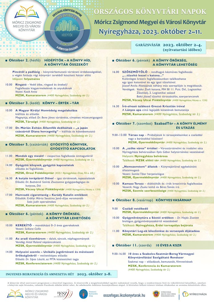 Ahogy a könyv évszázadok óta, úgy a 21. század sikeres könyvtára is híd – emberek, közösségek, kultúrák, gondolatok között. A 2023. évi Országos Könyvtári Napok célja az elmúlt évek fontosabb települési könyvtári fejlesztéseinek, illetve olyan jó gyakorlatoknak a bemutatása, amelyek kifejezik a könyvtárak híd szerepét – legyen szó a kulturális örökség megőrzéséről, az emberi kapcsolatokról, a generációk együttműködéséről.