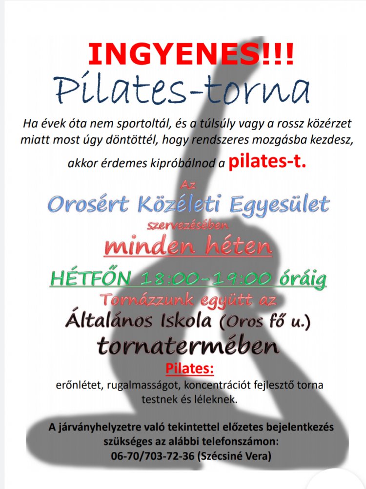 Az ingyenes pilates-tornákat minden hétfőn 18 órától tartják majd az orosi általános iskola tornatermében. A foglalkozások 60 percesek.