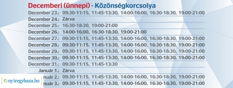 Minden nap tárt kapukkal várja látogatóit a Nyíregyházi Városi Jégpálya. A nyitvatartás az alábbiak szerint alakul: