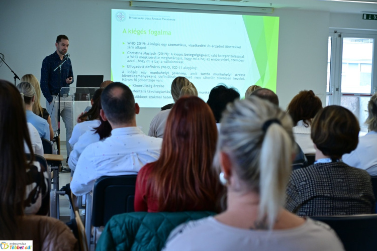 Magasba lendültek a kezek dr. Tóth Gábor adjunktus kérdésére, amikor a kiégésről tartott előadást a Jósa András Tagkórházban. A kórház a Lelki Egészség Világnapja alkalmából egy olyan napot szervezett dolgozóinak, amelynek középpontjában a saját lelki jóllétük állt. Ahogy a megnyitón is elhangzott: ez egy rendkívül megterhelő hivatás, ezért a lelki egészség megőrzése nem luxus, hanem elengedhetetlen, hiszen csak akkor tudnak segíteni másokon, ha ők maguk is jól vannak.