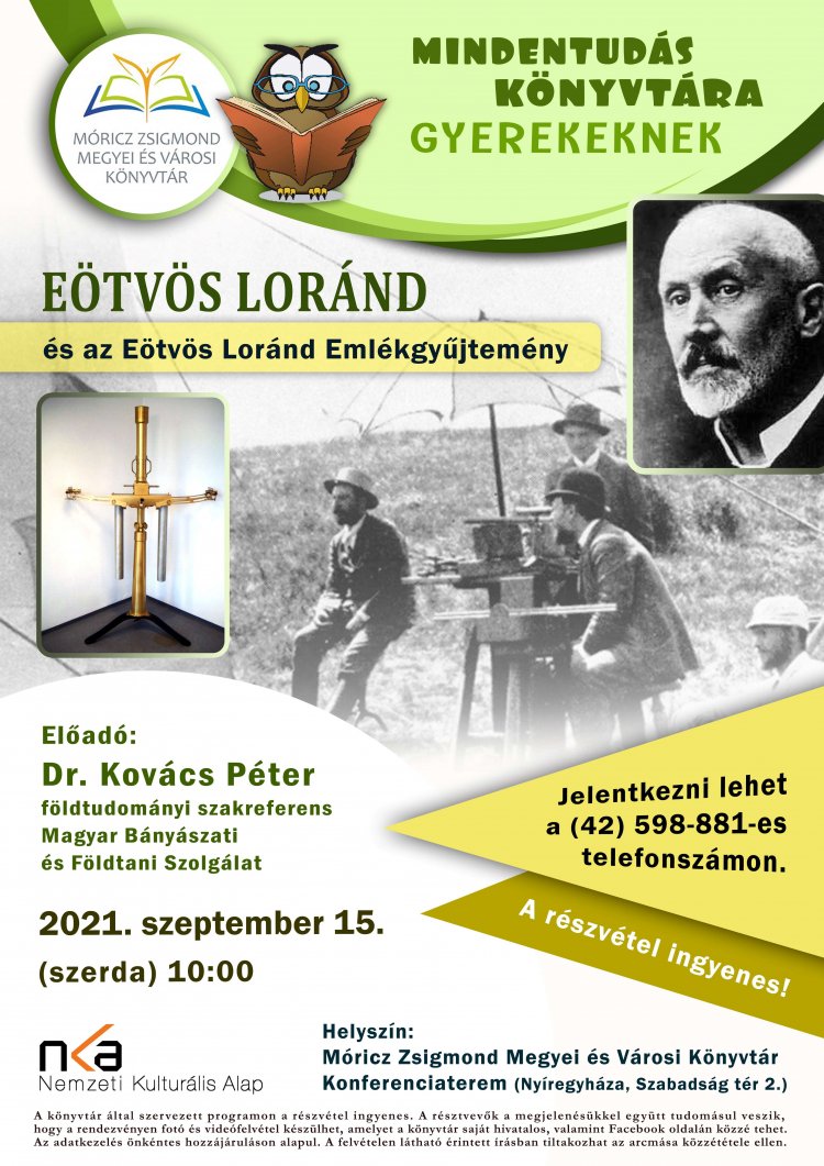 A Mindentudás Könyvtára - Gyerekeknek programsorozatban dr. Kovács Péter földtudományi szakreferens tart előadást szeptember 15-én a Móricz Zsigmond könyvtárban. Az előadás témája: Eötvös Loránd és az Eötvös Loránd Emlékgyűjtemény