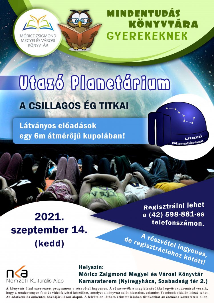 A Móricz Zsigmond Megyei és Városi Könyvtár vendége lesz az Utazó Planetárium szeptember 14-én. A Mindentudás Könyvtára Gyerekeknek című programsorozatban látványos előadáson vehetnek részt mindazok, akik regisztrálnak a programra.