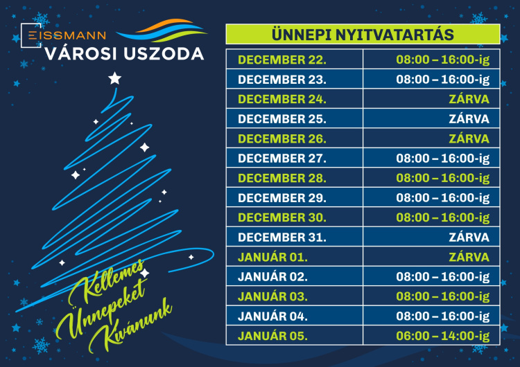 A kulturális események mellett az aktív pihenésre is van lehetőség. Az ünnepi időszakban nyitva tart a Nyíregyházi Városi Uszoda is. December 27. és 30. között reggel 6 órától este 8 óráig, míg szilveszter napján 6 és 14 óra között várják a vendégeket. Az úszás és a szaunázás sokak számára ideális ellensúlya lehet az ünnepi lakomáknak, január 1-jén azonban az uszoda zárva tart.