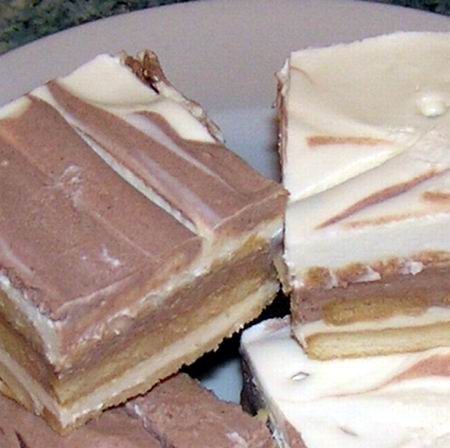 Egy közepes méretű (20x30 cm) tepsi aljára tegyünk egy réteg háztartási kekszet. Kenjük el rajta a vaníliás tejföl kétharmadát. Fedjük be egy réteg keksszel, egyengessük el rajta a kakaós tejföl kétharmadát. Borítsuk be egy újabb réteg keksszel, majd a maradék vaníliás és kakaós tejfölt öntsük a tetejére, egyengessük el, fogpiszkálóval tetszés szerint rajzoljunk bele mintákat.