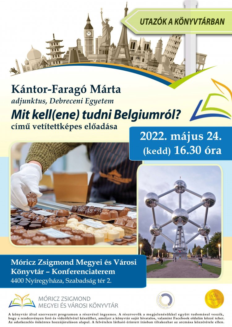 Május 24-én folytatódik az Utazók a könyvtárban című programsorozat a Móricz Zsigmond könyvtárban. Ez alkalommal Kántor-Faragó Márta Belgiumról tart vetítettképes előadást.
