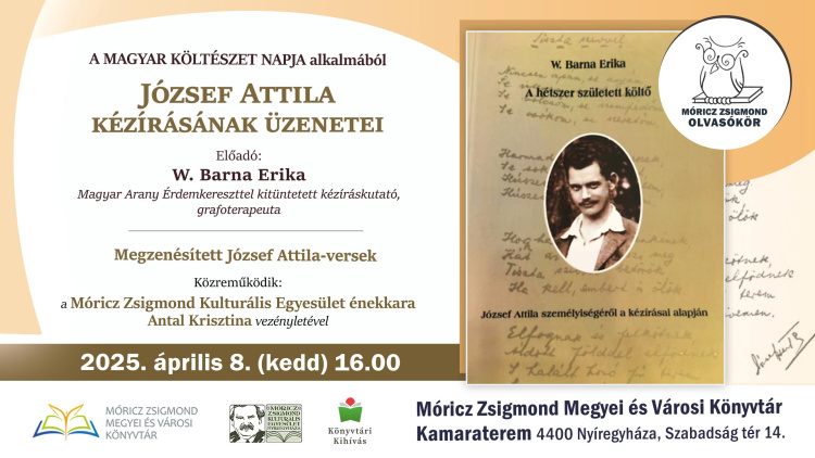 W. Barna Erika Magyar Arany Érdemkereszttel kitüntetett kézíráskutató, grafoterapeuta tart elődást József Attila kézírásáról. Az előadást megzenésített József Attila-versek színesítik.