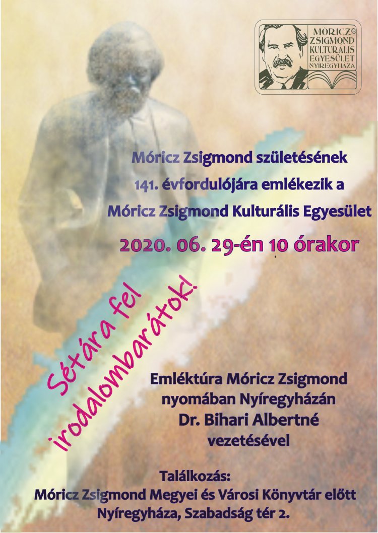 A Móricz Zsigmond Kulturális Egyesület június 29-én 1o órakor névadója születésének 141. évfordulójára nyíregyházi emlékhelyei és emlékjelei felkeresésével emlékezik- Dr. Bihari Albertné alapitó titkár vezetésével. Az egyes helyszíneken az író vonatkozó írásainak felolvasásával tarkítjuk az emléktúrát.