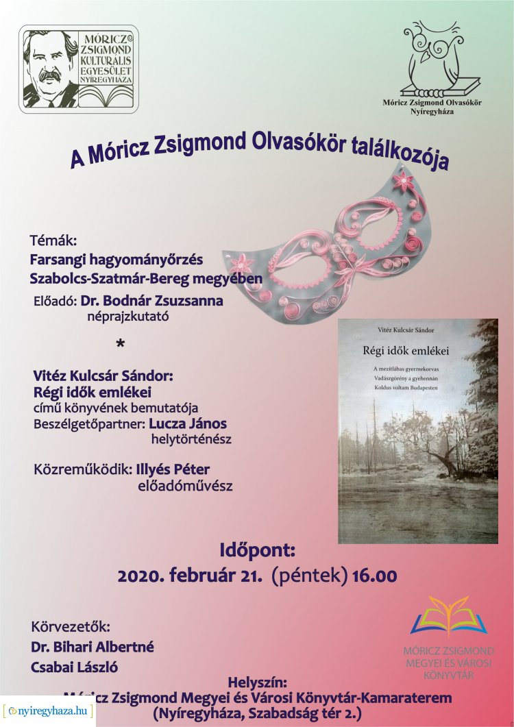 Farsangi hagyományőrzés Szabolcs-Szatmár-Bereg megyében címmel dr. Bodnár Zsuzsanna néprajzkutató tart előadást, valamint bemutatják Vitéz Kulcsár Sándor Régi idők emlékei című könyvét is a Móricz Zsigmond Olvasókör február 21-ei összejövetelén. Az irodalombarátokat a Móricz Zsigmond könyvtárba várják, 16 órára.