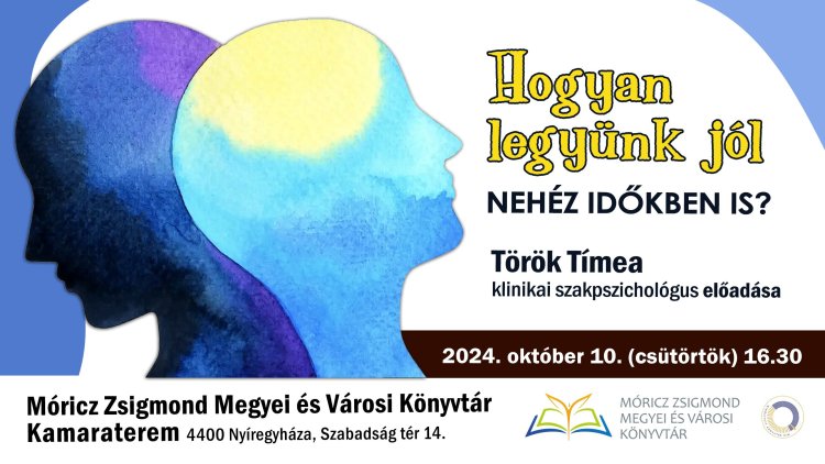 Török Tímea, klinikai szakpszichológus Hogyan legyünk jól nehéz időkben is? címmel előadást tart a Móricz Zsigmond Megyei és Városi Könyvtárban.