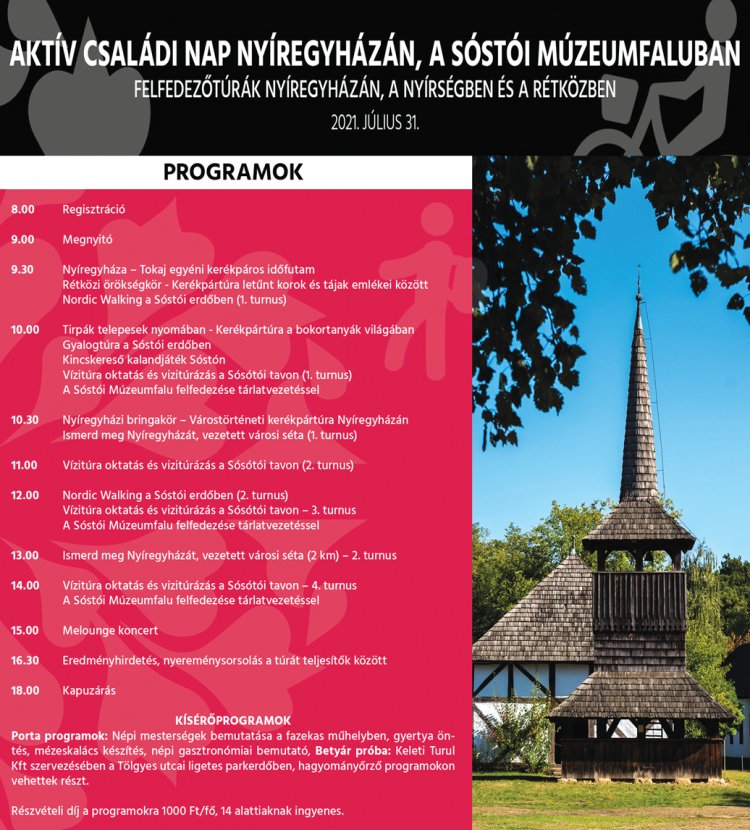 Mozgalmas, izgalmas családi nap központi helyszíne lesz július 31-én Nyíregyházán a Sóstói Múzeumfalu. Innen indulnak és ide érkeznek azok a vezetett kerékpár- és gyalogtúrák, melyek célja a Nyíregyháza, a Rétköz, a Sóstói erdő megismerése a Középkori Templomok Útja Egyesület szervezésében. A nap folyamán Nyíregyháza és a térség több aktív és turisztikai civil szervezetének közreműködésével számos aktív és kulturális program, sportesemény közül választhatnak az érdeklődők. (Megjelent a Nyíregyházi Napló július 30-ai számában.)
