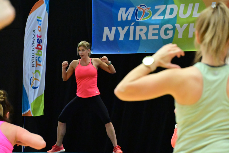 Béres Alexandra a Mozdulj Nyíregyháza! program keretében, a Continental Arénában tartott ingyenes edzést, amelyet ezúttal is rendkívüli érdeklődés övezett. A program célja, hogy minden korosztály számára hozzáférhetővé tegye a mozgás örömét, és különböző sportolási lehetőségeket kínáljon.