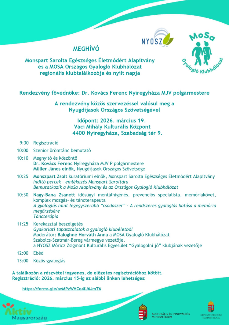 A nyíregyházi rendezvény lehetőséget ad arra, hogy az érdeklődők közelebbről is megismerkedjenek a MoSa Gyalogló Klubhálózat működésével, valamint a gyalogló klubok tevékenységével. A program egyben regionális találkozó is, ahol a résztvevők tapasztalatot cserélhetnek, és betekintést nyerhetnek az egészséges életmódot támogató kezdeményezésekbe.