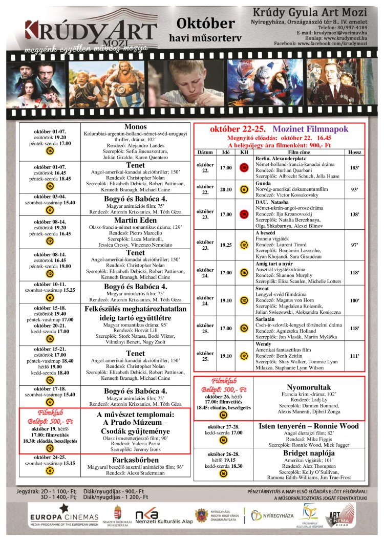 Mozinet Filmnapok október 22-25. között, a Bridget naplója, a Tenet című filmek is szerepelnek megyénk egyetlen művész mozijának októberi filmkínálatában. (Részletes műsorterv!)