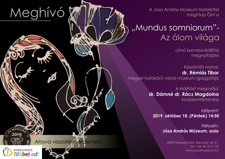 "Mundus somniorum" - Az álom világa címmel nyílik kamarakiállítás október 18-án a Jósa András Múzeumban. A tárlat az aulában fogadja az érdeklődőket.