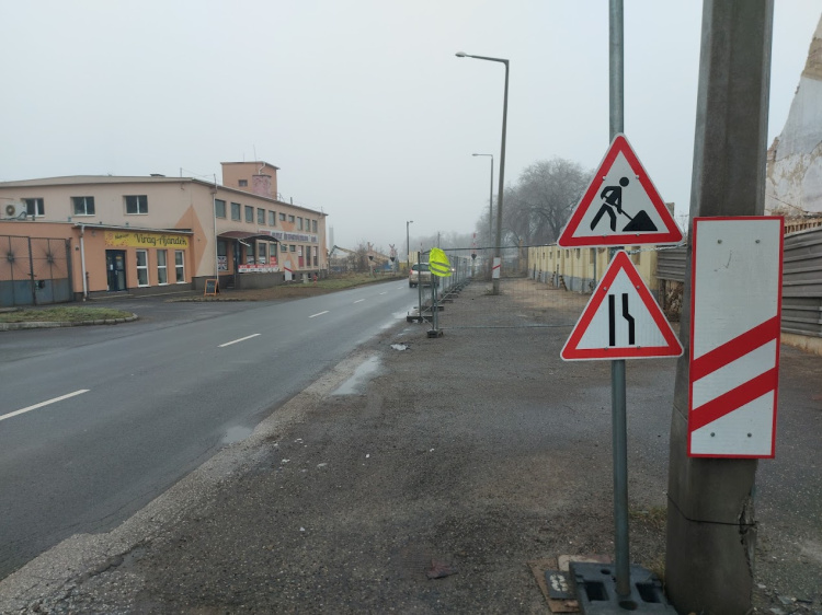 Útszűkület, úton folyó munka nehezíti a közlekedést.