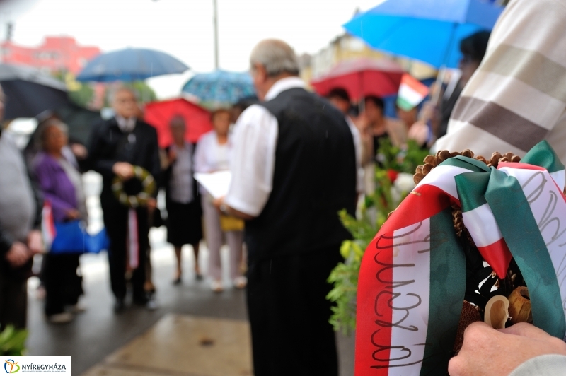 Nagy Imre születésének 120. és halálának 58. évfordulója alkalmából a mártírhalált halt miniszterelnök nyíregyházi domborművénél a megemlékezés résztvevői elhelyezték az emlékezés virágait.
