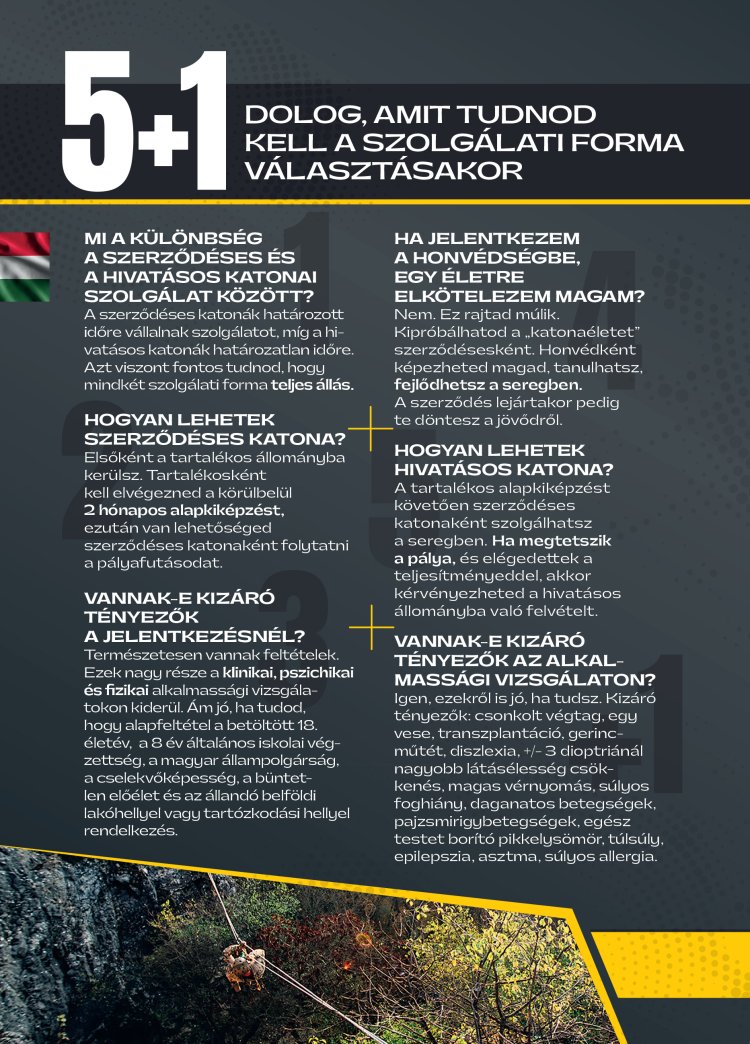A honvédség vonzó életpályát kínál azok számára, akiknek az egyéni fejlődésen túl fontos a közösség, a bajtársiasság, a fiatalos szemlélet, és emellett a high-tech haditechnikai eszközök iránt is érdeklődnek.