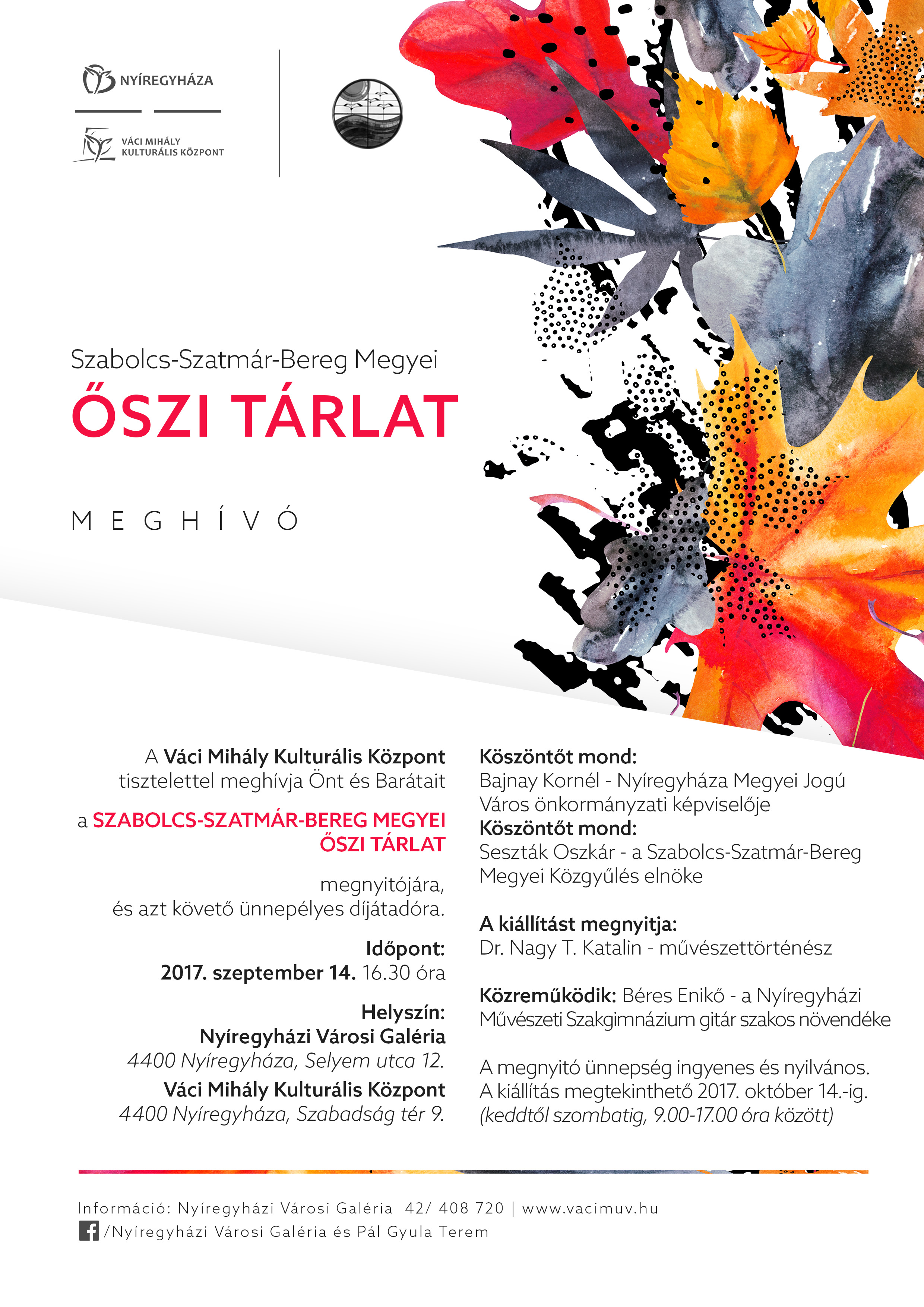 80 megyei kortárs képzőművész, közel 300 alkotással pályázott a Megyei Őszi Tárlatra, melyet idén a Városi Galériában, illetve a Váci Mihály Kulturális Központ I. emeleti galériájában szeptember 14-től október 14-ig tekinthetnek meg.A tárlatot Dr. Nagy T. Katalin művészettörténész nyitja meg csütörtök délután 16 óra 30-kor. A kiállításra került anyagról, illetve a város és a megye nívódíjasáról képzőművészekből álló zsűri dönt.