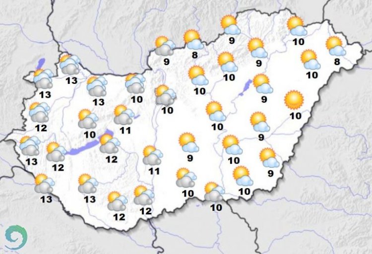 Késő délutántól északnyugat felől egyre többfelé beborul az ég, és este a Dunántúl északi felén és az ország középső részén az eső is elered. A mérsékelt déli szél időnként megélénkül. A legmagasabb nappali hőmérséklet 11 és 15 fok között valószínű, de a délnyugati határ mentén valamivel melegebb is lehet. Késő estére általában 5, 13 fokra hűl le a levegő.