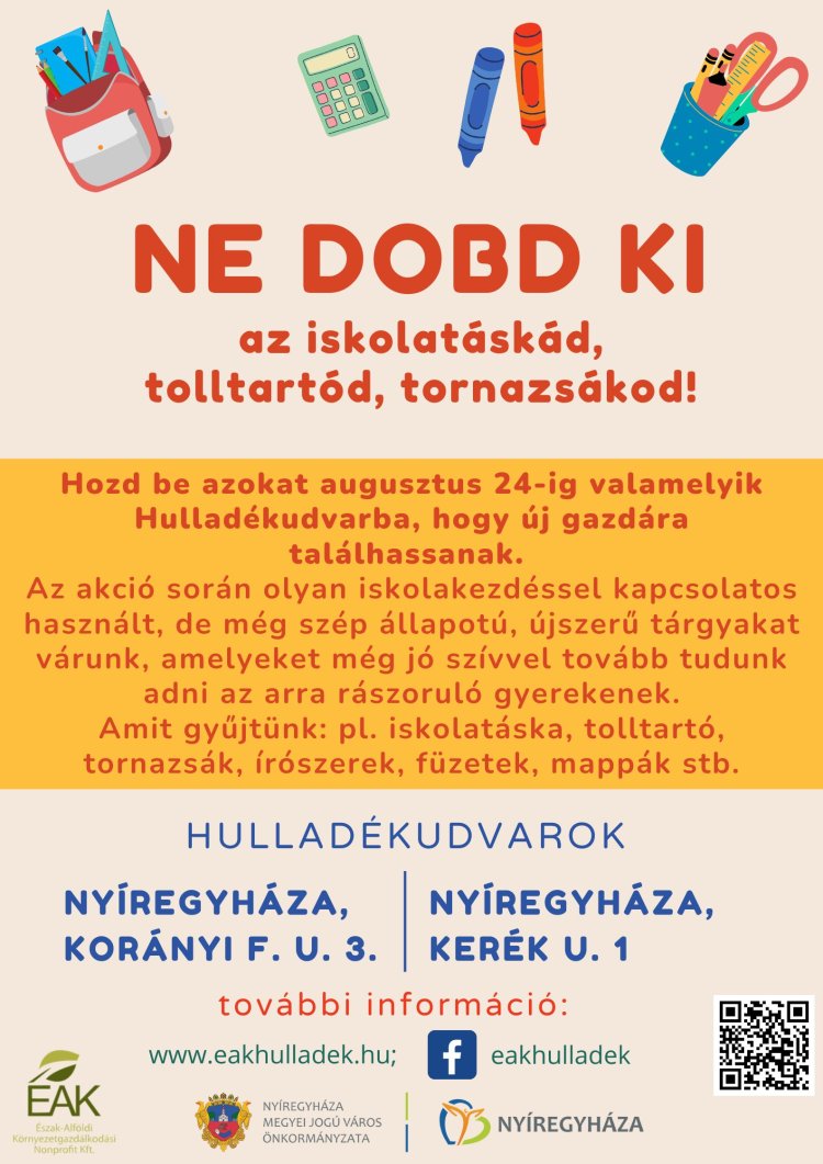 Nyíregyháza Megyei Jogú Város Önkormányzata és az ÉAK Nonprofit Kft. augusztus 24-ig tartó gyűjtőakciójával hozzá szeretne járulni a „fenntartható” iskolakezdéshez.