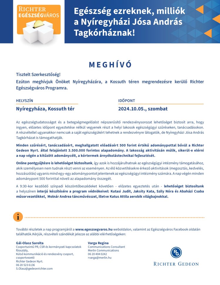 Október 5-én (szombaton) Nyíregyházára érkezik a Richter Egészségváros, melyre szeretettel hívjuk és várják az érdeklődőket!
