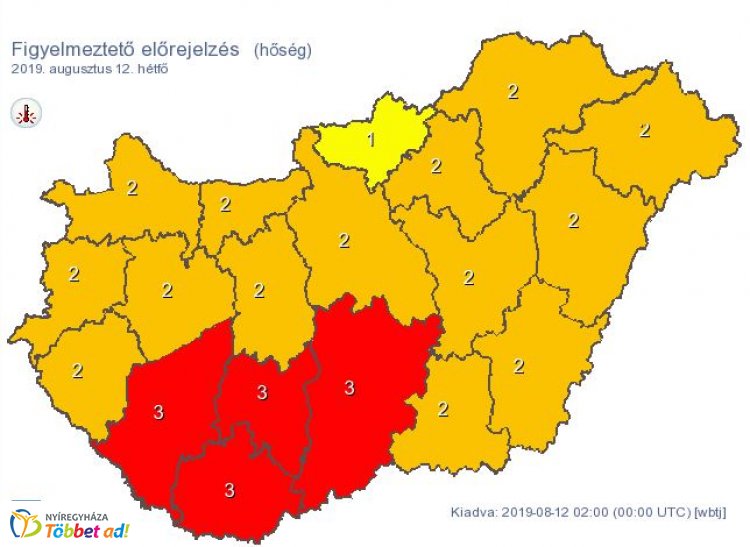 Baranya, Somogy, Tolna és Bács-Kiskun megyére adtak ki a harmadfokú figyelmeztetést. Másodfokú a figyelmeztetés Budapesten, Pest, Békés, Borsod-Abaúj-Zemplén, Csongrád, Fejér, Győr-Moson-Sopron, Hajdú-Bihar, Heves, Jász-Nagykun-Szolnok, Komárom-Esztergom, Szabolcs-Szatmár-Bereg, Vas, Veszprém és Zala megyében. Nógrád megyére elsőfokú figyelmeztetést adtak ki ugyancsak a hőség miatt.
