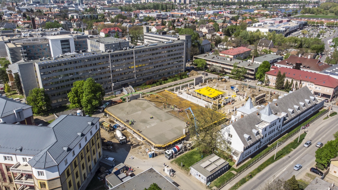 Jelen pillanatban a parkolóház födémbetonozása zajlik, ehhez 1600 köbméter betont használnak fel. Ez egy egy lélegzetvételi munkaütem, hiszen a betonozást egyszerre szükséges elvégezni, ezért szükséges volt lezárásokat is elvégezni a kórház területén. Az éjszaka folyamán a beton simításokat végzik, ez zajjal fog járni, de a reményeink szerint meg lesz a gyümölcse, hiszen egy olyan létesítménnyel gazdagodik a kórházunk, ami a közlekedők, a betegek és látogatók érdekeit fogja szolgálni.