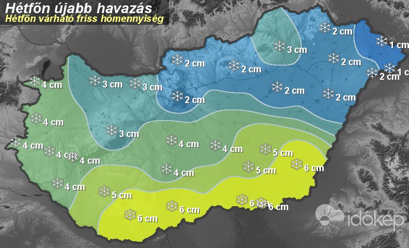 A hétvégére érkezett tél a jövő hét elején sem tágít, a vasárnapról hétfőre virradó éjjel dél-délnyugat felől újabb csapadékmező érkezik, így hétfő reggel az északi-északkeleti tájak kivételével ismét többfelé havazhat. Napközben nyugaton megszűnhet a havazás, de a Dunántúl más tájain még számíthatunk hószállingózásra, kisebb havazásra, a Dunától keletre viszont több centiméterrel gyarapodhat a hóréteg.
