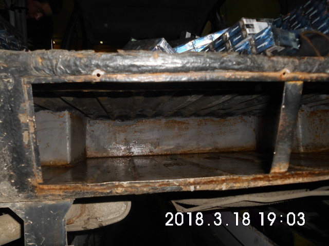 A NAV munkatársai Záhonynál egy szlovák gépkocsit ellenőriztek. A tételes vámvizsgálaton, a jármű megduplázott csomagtartó padlójában, az üzemanyagtartálynál kialakított üregben, a küszöbökben, a megduplázott kardánalagútban, valamint a két első sárvédőben kialakított rejtekhelyekben 4 500 doboz cigarettát találtak.