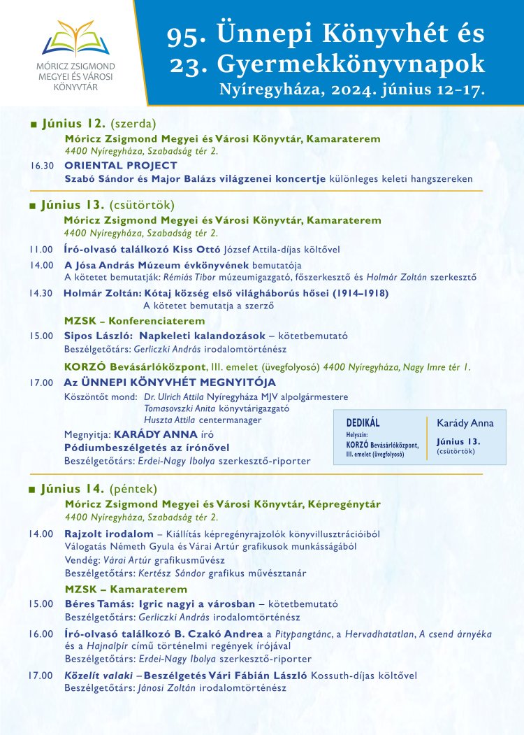 Kilencvenötödik alkalommal rendeznek Könyvhetet Magyarországon. A programsorozathoz aktívan kapcsolódik a nyíregyházi Móricz Zsigmond Megyei és Városi Könyvtár, ahol már 23. alkalommal Gyermekkönyvnapokat is tartanak. A hagyományhoz híven ilyenkor igyekeznek közelebb hozni írót és olvasót egymáshoz. Lássuk a részleteket!