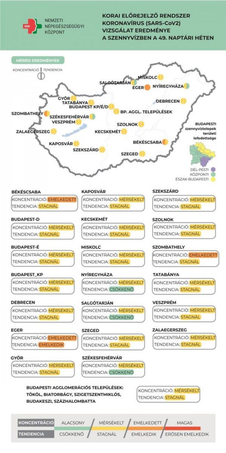 Az NNK a honlapján azt írta: Egerben emelkedik a koronavírus örökítőanyagának koncentrációja a szennyvízben a 49. heti adatok szerint, a hevesi megyeszékhely mellett Szombathelyen és Békéscsabán az átlagosnál magasabb ez az érték.