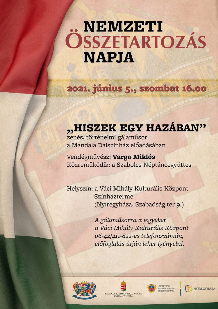A nemzeti összetartozás napja tiszteletére zenés, történelmi gálaműsor lesz június 5-én a Váci Mihály Kulturális Központban, a Mandala Dalszínház előadásában. A „Hiszek egy hazában" című gálaműsor vendégművésze Varga Miklós lesz, közreműködik a Szabolcs Néptáncegyüttes.
