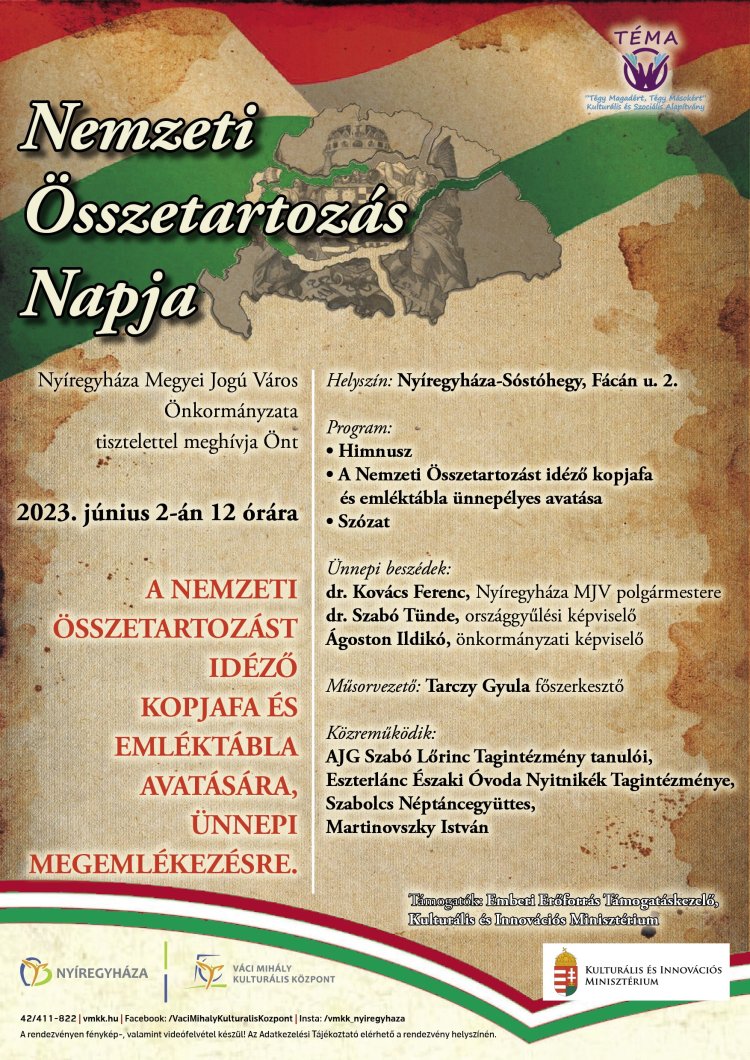 Nyíregyháza Megyei Jogú Város Önkormányzata ünnepi megemlékezést rendez június 2-án a Nemzeti Összetartozás Napja alkalmából. További részleteket a plakáton olvashatnak!